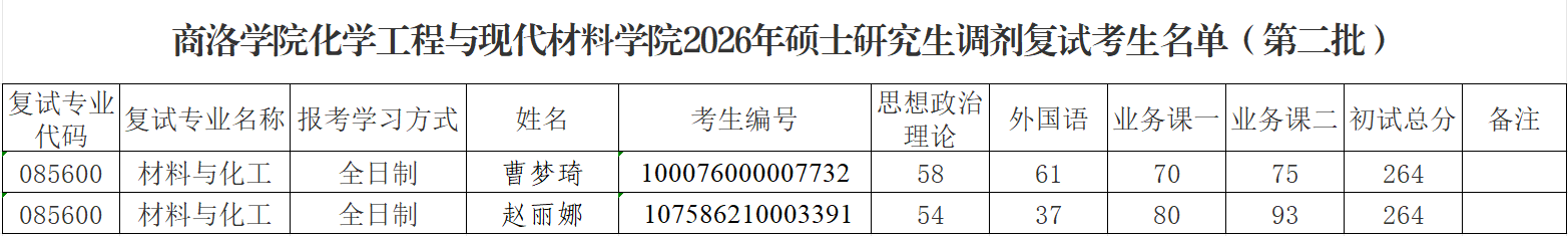 商洛学院化学工程与现代材料学院2026年硕士研究生调剂复试考生名单(第二批)