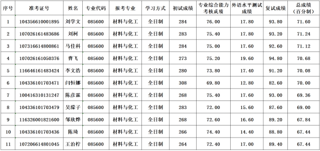 根据《商洛学院 2026 年全国硕士研究生招生复试录取工作方案》《商洛学院2026年硕士研究生招生调剂工作方案》以及《商洛学院材料与化工硕士点2026年研究生调剂复试工作安排》,学院于4月9日对具有复试资格的2026年材料与化工专业硕士研究生调剂考生进行了复试,现将复试成绩及总成绩予以公示。