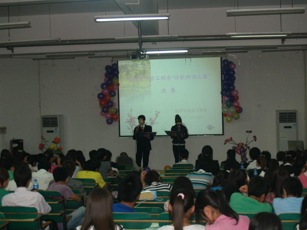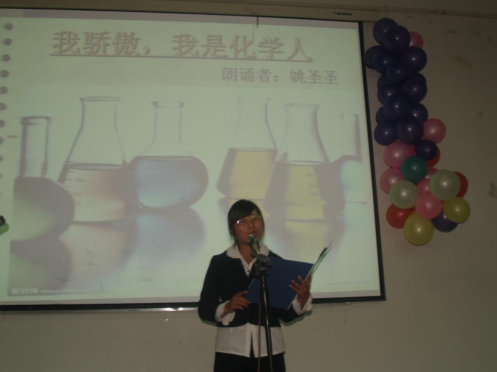 经过激烈的角逐诗歌朗诵共评选出优秀奖8名,三等奖4名,二等奖2名,一等奖被10级应用化学2班姚圣圣同学摘得。