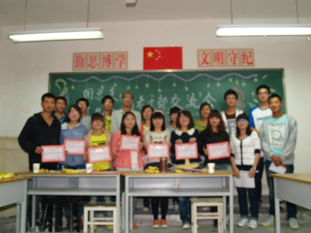 2013年10月10日晚,化学与化学工程系团总支系分会在团总支书记武老师的领导下,组织举办了我系11.12级团总支系分会新老干部交流会,与会的有团总支书记武老师、副书记董小刚、系分会主席王哲以我系团总支系分会11.12级的全体干部成员。