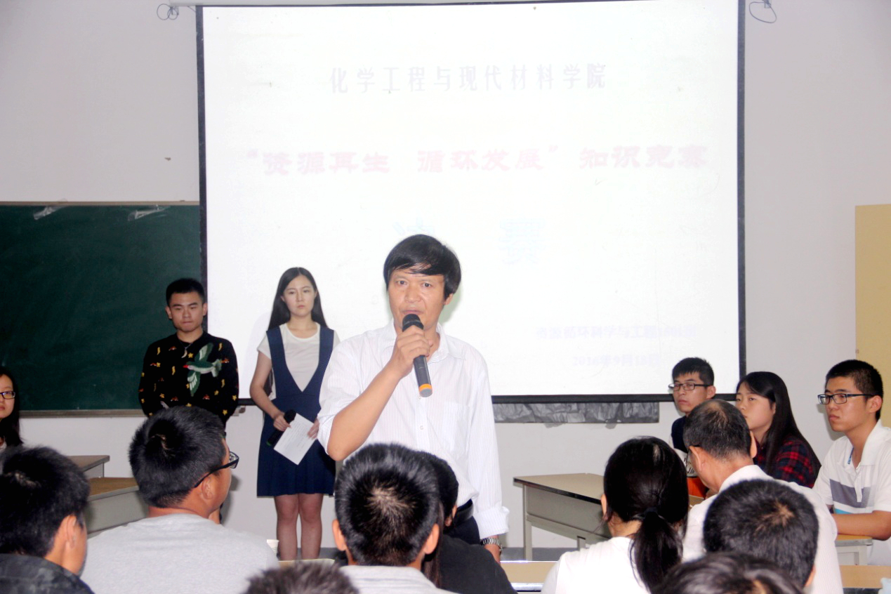 为庆祝资源循环科学与工程专业成立一周年,吸引更多的学生对本专业的了解,让广大学生感受到循环经济的魅力与发展前景,我院资源循环工程系联合团总支学生会,于9月18日在五号楼504多媒体教室举办“资源再生、循环发展” 知识竞赛。院长周春生教授、党总支书记李军富教授、副院长王书民教授、三位资源循环工程系教师以及2015级、2016级资源循环科学与工程专业的学生现场参加了比赛。张旭、李盼、杨智婷组赢得专业学生的一致认可,摘得桂冠。