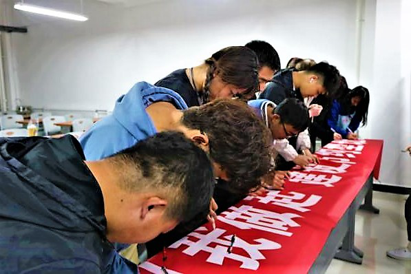 化学2002、应化1901、材料1911团支部组织班级同学在团支书带领下在象征着决心的横幅上郑重签下自己的名字,并将横幅悬挂在教室上方,为的是将节约意识深刻植入每一位同学的思想和行动中。