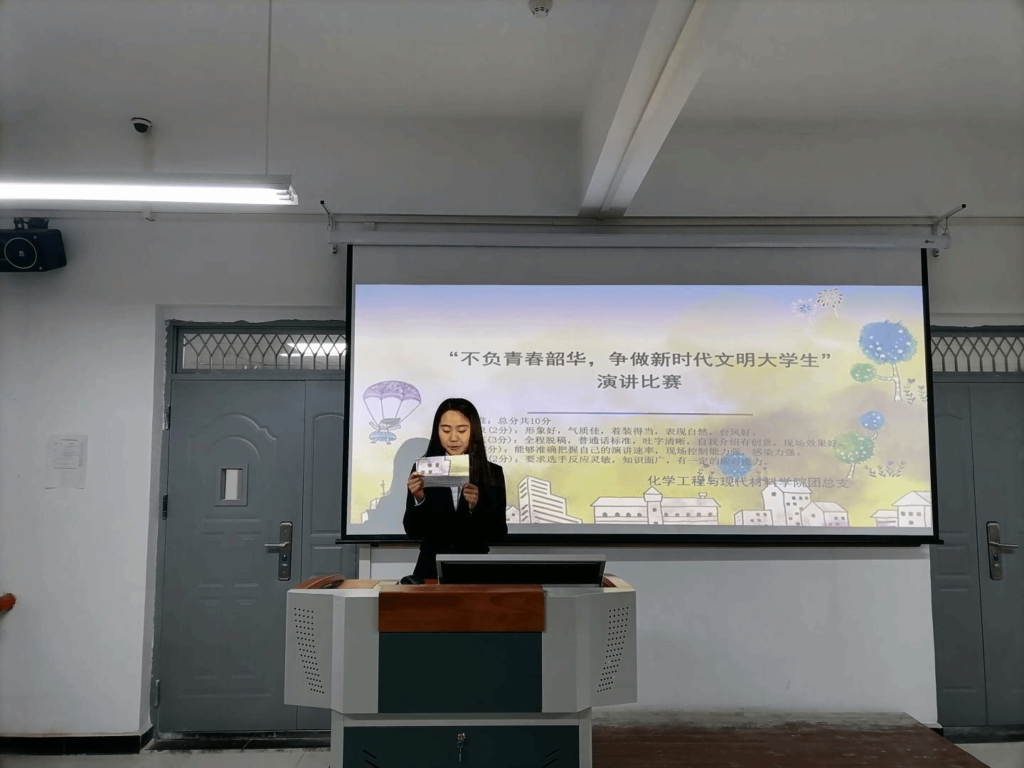为积极引导我院学生树立文明意识,培养使命担当的情怀,2020年11月6日晚七点,我院于丹江4号楼205教室举办以“不负青春韶华,争做新时代文明大学生”主题演讲比赛,担任本次比赛评委的有团总支书记房禹、学生会主席团及学生会各部门部长。本次比赛比由张紫萱、周幕伦主持。
