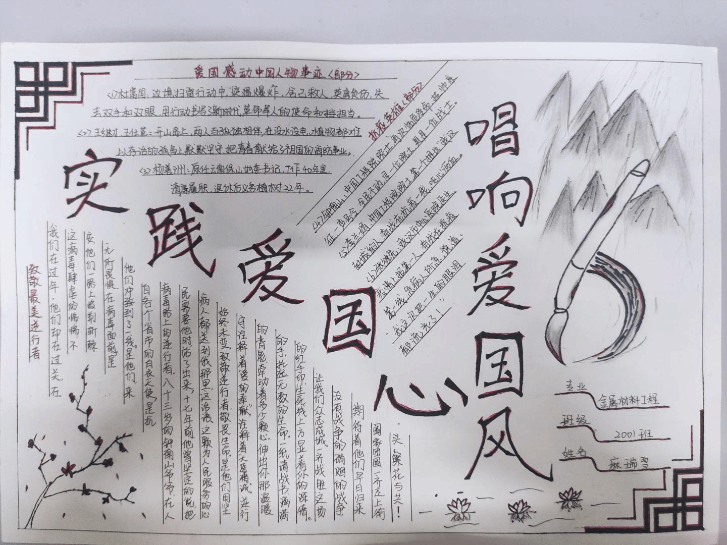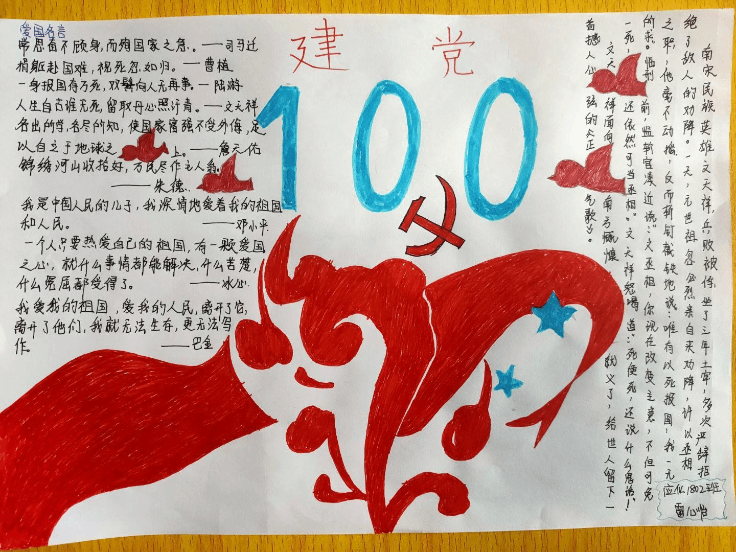 旧的一年缓缓而去,新的一年如期而至。我们告别了充满挑战、历经挫折的2020年,在那一年,新冠的压迫、同胞的离去、再到后来的全民抗疫,中华民族经历了前所未有的浩劫。在此中国共产党建党百年华诞之际,我院团总支学生会组织部于2021年3月1日下午13:00至2021年3月4日下午16:00举办“唱响爱国风,实践爱国心”主题手抄报活动。活动期间,同学们积极参加,踊跃报名,以手抄报的形式表达了浓浓的爱国情。