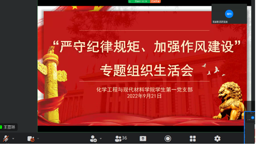 根据化材学院党委《关于在全院开展纪律教育学习宣传月活动的通知》安排,引导全体党员、干部坚定理想信念,增强政治责任担当,以风清气正的政治生态迎接党的二十大胜利召开。化材学院学生第一党支部于2022年9月21日16:30-18:30在钉钉平台召开了“严守纪律规矩、加强作风建设”线上专题组织生活会。本次会议由党支部书记王嘉琳主持,学工办主任李馥利、辅导员戴壹以及本支部全体党员、预备党员33人参加会议。