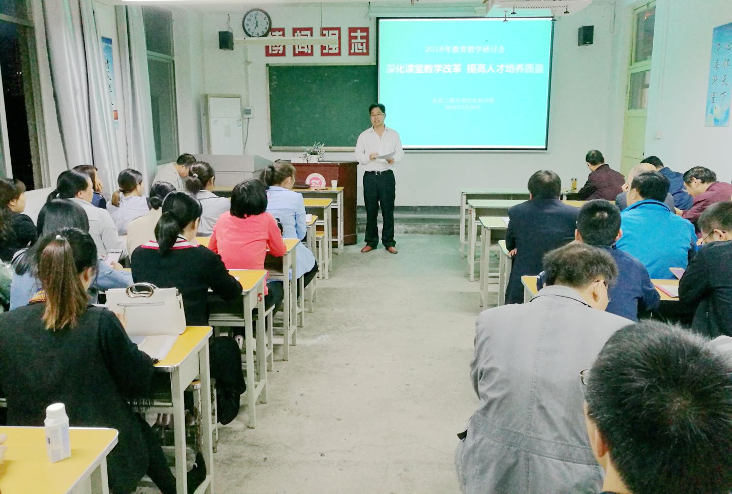 为了落实教育部“新时代全国高等学校本科教育工作会议”精神,坚持以本为本,推进四个回归,加快建设高水平本科教育,全面提高人才培养能力,推动我院教育教学改革,进一步提升教学质量,实现内涵式发展。2018年9月29日晚,我院在5号教学楼307教室召开2018年教育教学研讨会,主题为“深化课堂教学改革,提高人才培养质量”。院领导周春生、李军富、张国春以及全体教职员工参加了会议。研讨会由副院长张国春主持。