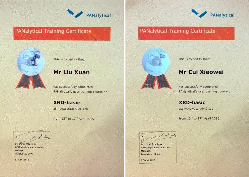 通过为期五天的培训,两位教师基本掌握了:XRD的理论知识和检测操作技巧、HighScore Plus软件的应用以及仪器日常维护与保养,并于4月17日下午顺利通过考试,取得培训证书。为日后更好地使用仪器,开展教学、科研工作,服务于地方经济发展奠定了基础。