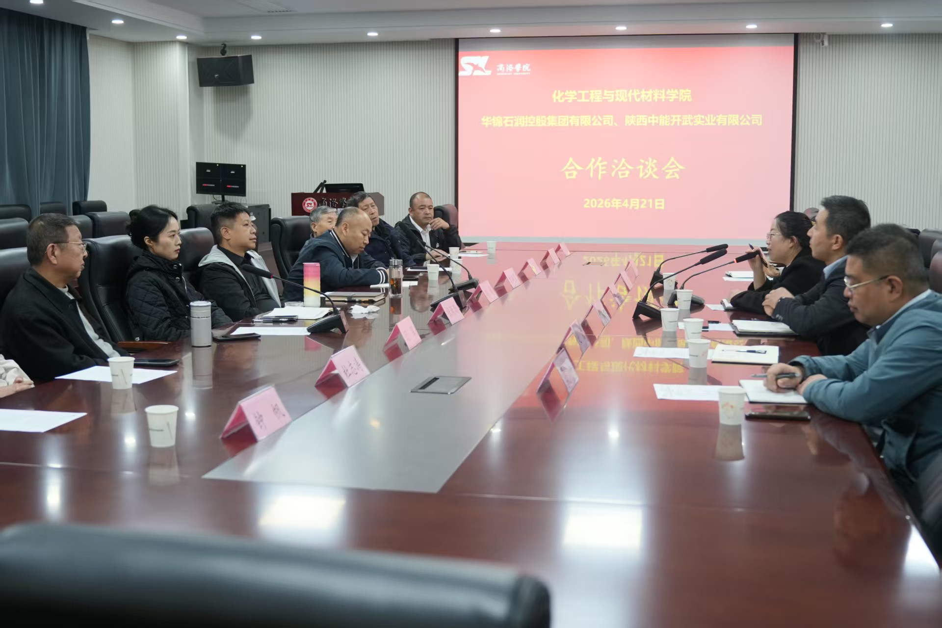 2025年4月21日,陕西省国防企业创新发展促进会副会长、华锦石润控股集团有限公司董事长潘举率集团副总裁刘战国、陕西中能开武实业有限公司总经理张珊珊等一行9人,莅临商洛学院化学工程与现代材料学院,在丹江校区举行合作洽谈会。院长曹宝月主持会议。