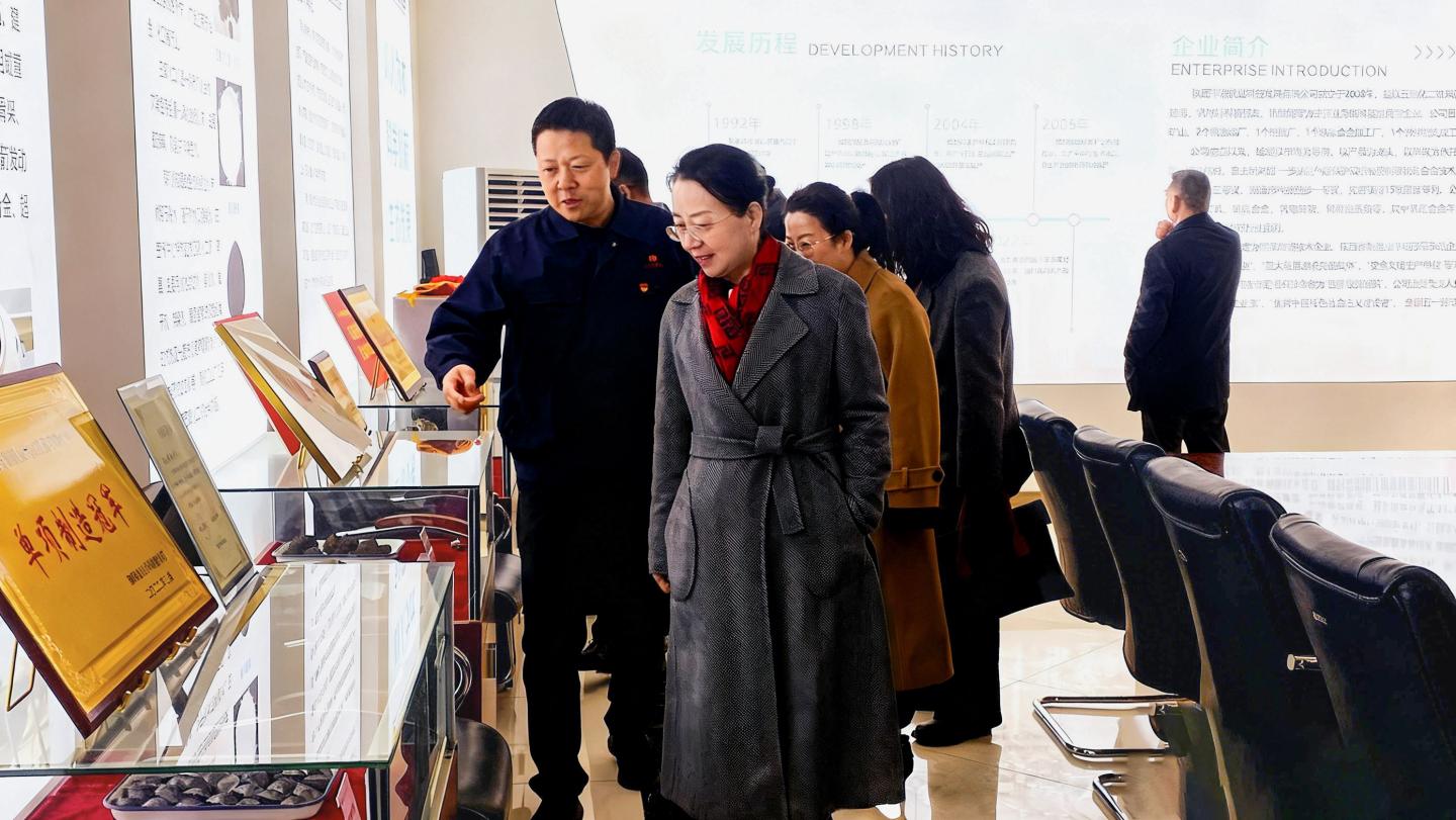 调研中,在山阳县副县长陈琳的陪同下,权雅宁一行先后走访了陕西丰源钒业科技发展公司、王庄桐木沟尾矿库实地考察。在企业生产车间,权雅宁一行详细了解钒资源开发流程、技术创新及尾矿处理现状,与企业负责人面对面交流,探讨当前尾矿处置过程中面临的技术瓶颈与研发方向;在尾矿库现场,实地察看生态修复、尾矿资源化利用推进情况,围绕尾矿无害化处置、绿色矿山建设等关键问题深入研讨,为校地校企后续开展技术联合攻关、促进科研成果转化筑牢实践基础。