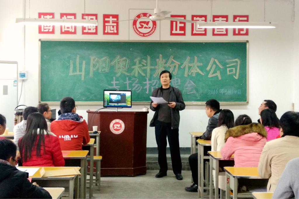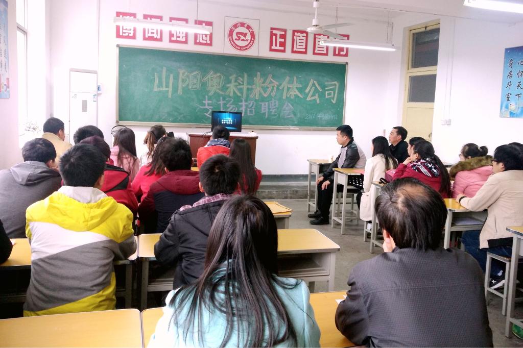 2016年3月14日,山阳奥科粉体有限公司来我院招聘优秀毕业生。下午14:30,在5—307教室我院化学、应用化学、金属材料工程、应用化工技术等专业32名大四学生齐聚一堂,参加山阳奥科粉体有限公司的招聘会。